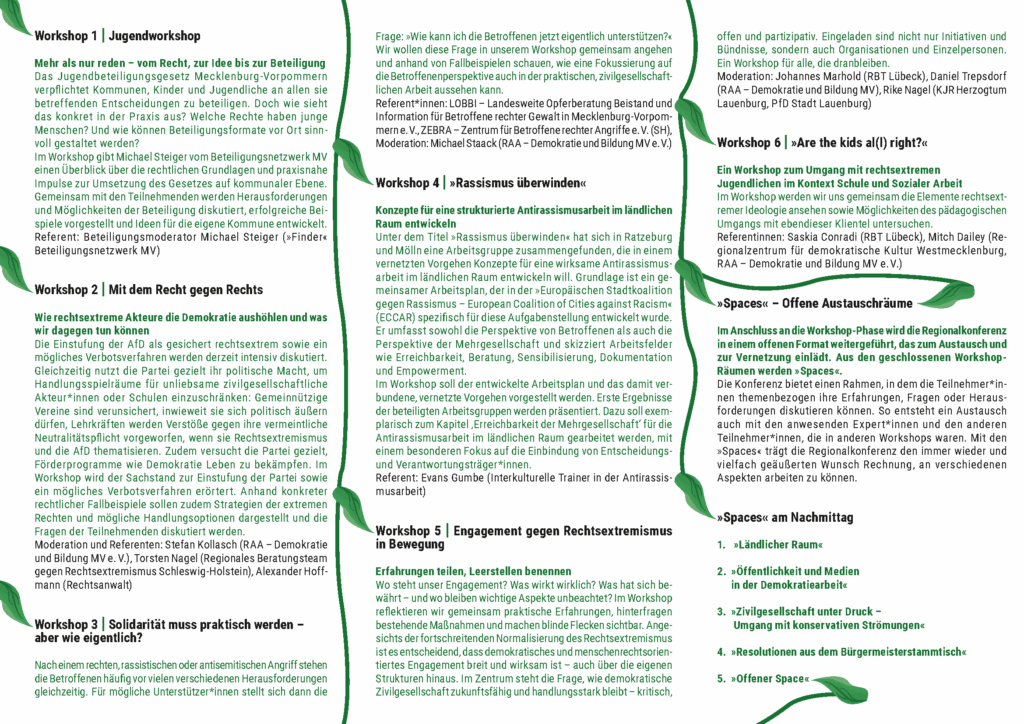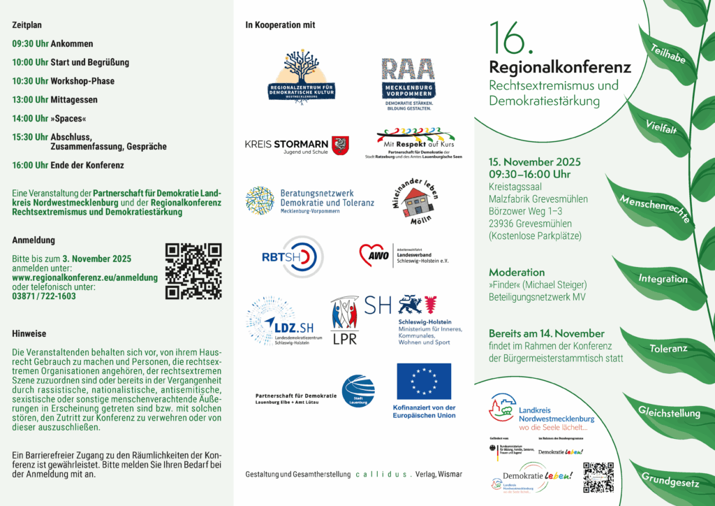 Die Regionalkonferenz Rechtsextremismus & Demokratiestärkung macht am 15.11.2025 zum zweiten Mal in ihrer Geschichte Station in Grevesmühlen. Sie folgt einer Einladung der Partnerschaft für Demokratie des Kreises Nordwestmecklenburg. Einen Tag lang lädt sie demokratisch engagierte Menschen aus der Zivilgesellschaft, des kommunalen Ehrenamtes sowie aus hauptamtlichen Institutionen in einen breiten Austausch zur Wissensvermittlung, zur gegenseitigen Stärkung und zur Vernetzung. Das Organisationsteam der Regionalkonferenz und die Verantwortlichen der Partnerschaft für Demokratie haben gemeinsam ein Konferenzprogramm im Workshopformat entwickelt, dass sich praxisnah und fachlich fundiert mit aktuellen Herausforderungen von Rechtsextremismus in Gesellschaft, Schule, Kommunalpolitik und Verwaltung befasst. Ebenso werden Strategien zur Überwindung von Rassismus im ländlichen Raum diskutiert. Die Regionalkonferenz möchte zudem Initiativen bei ihrer Arbeit gegen Rechtsextremismus mit fachlichen Beitragen unterstützen, so zu Strategien der extremen Rechten, zu rechtlichen Handlungsoptionen oder zum Umgang mit Bedrohung und Gewalt durch Rechtsextreme.